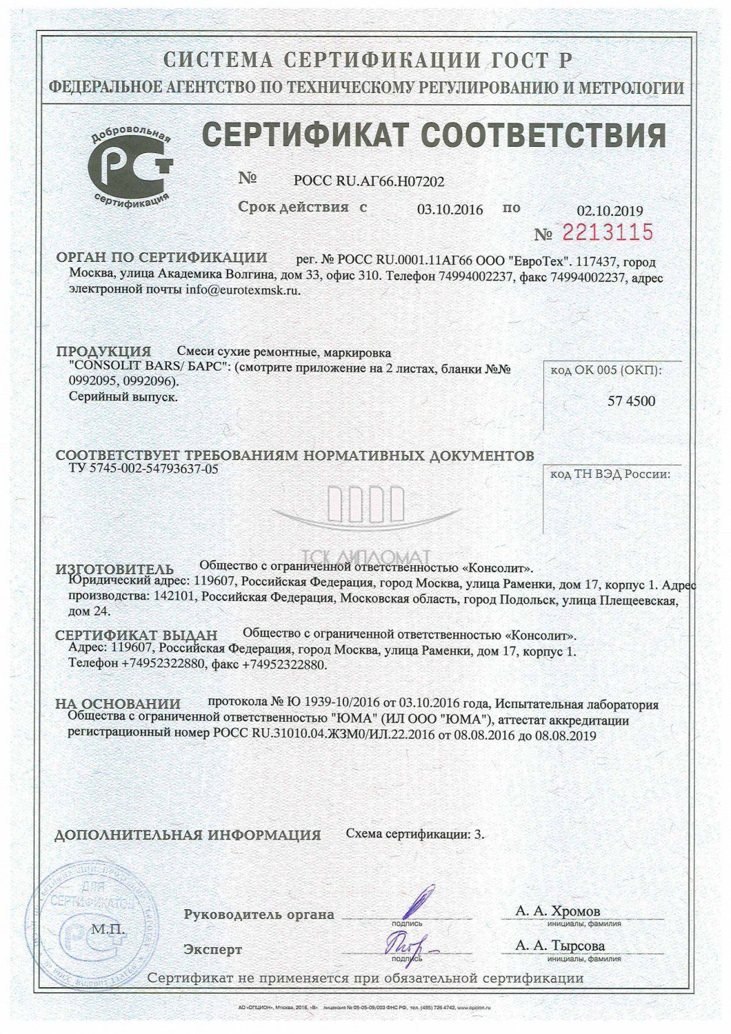 CONSOLIT BARS 100 содержит цемент, который при взаимодействии с водой дает щелочную реакцию. Поэтому при работе со смесью необходимо защищать глаза и кожу. В случае контакта пораженные места необходимо промыть водой и обратиться за помощью к врачу.