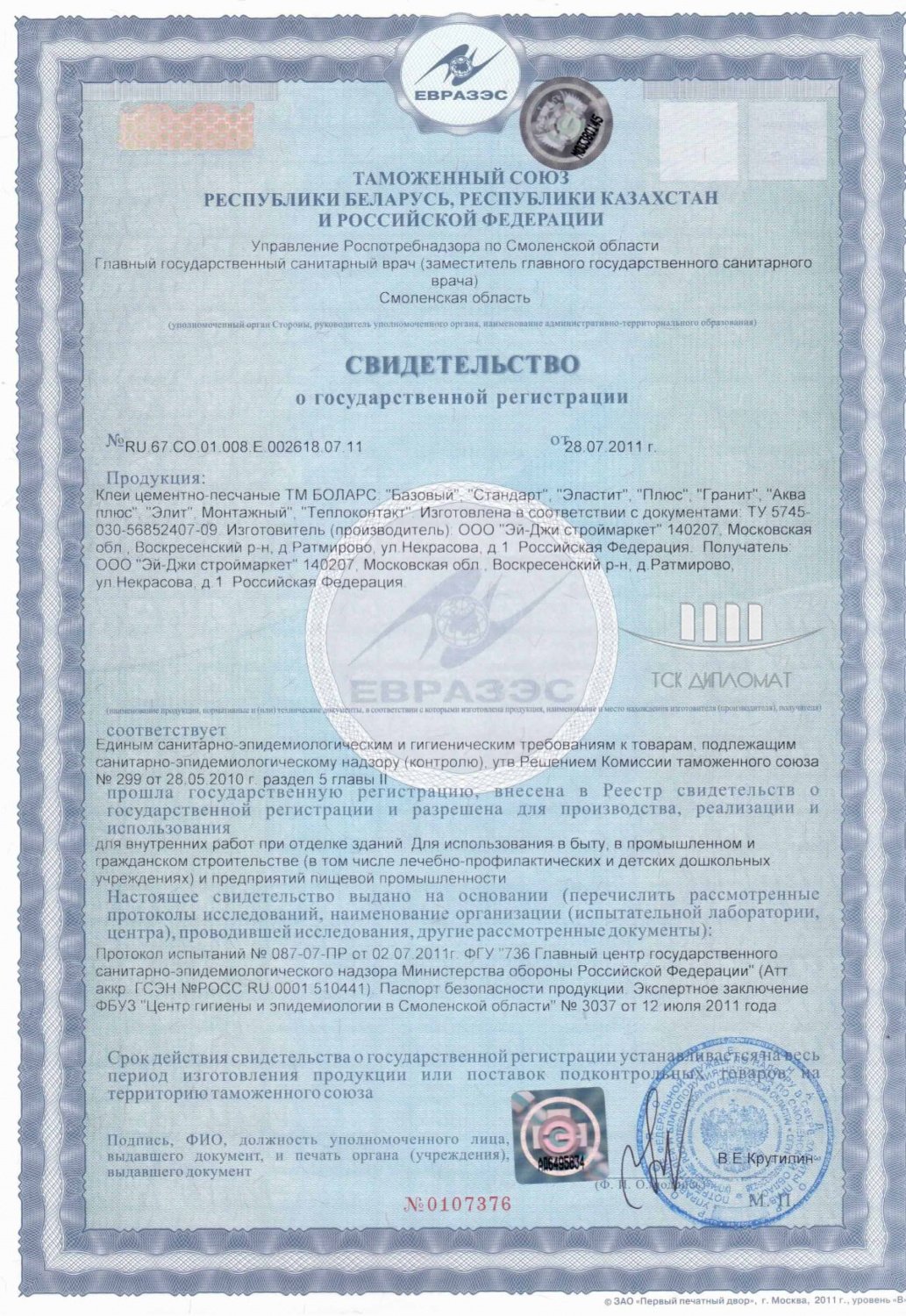 Сертификат соответствия № РОСС RU. И062. ОС02. ПО004 в системе ГОСТ РФ. Изготовлен данный клей в соответствии с ТУ 5745-030-56852407-09.