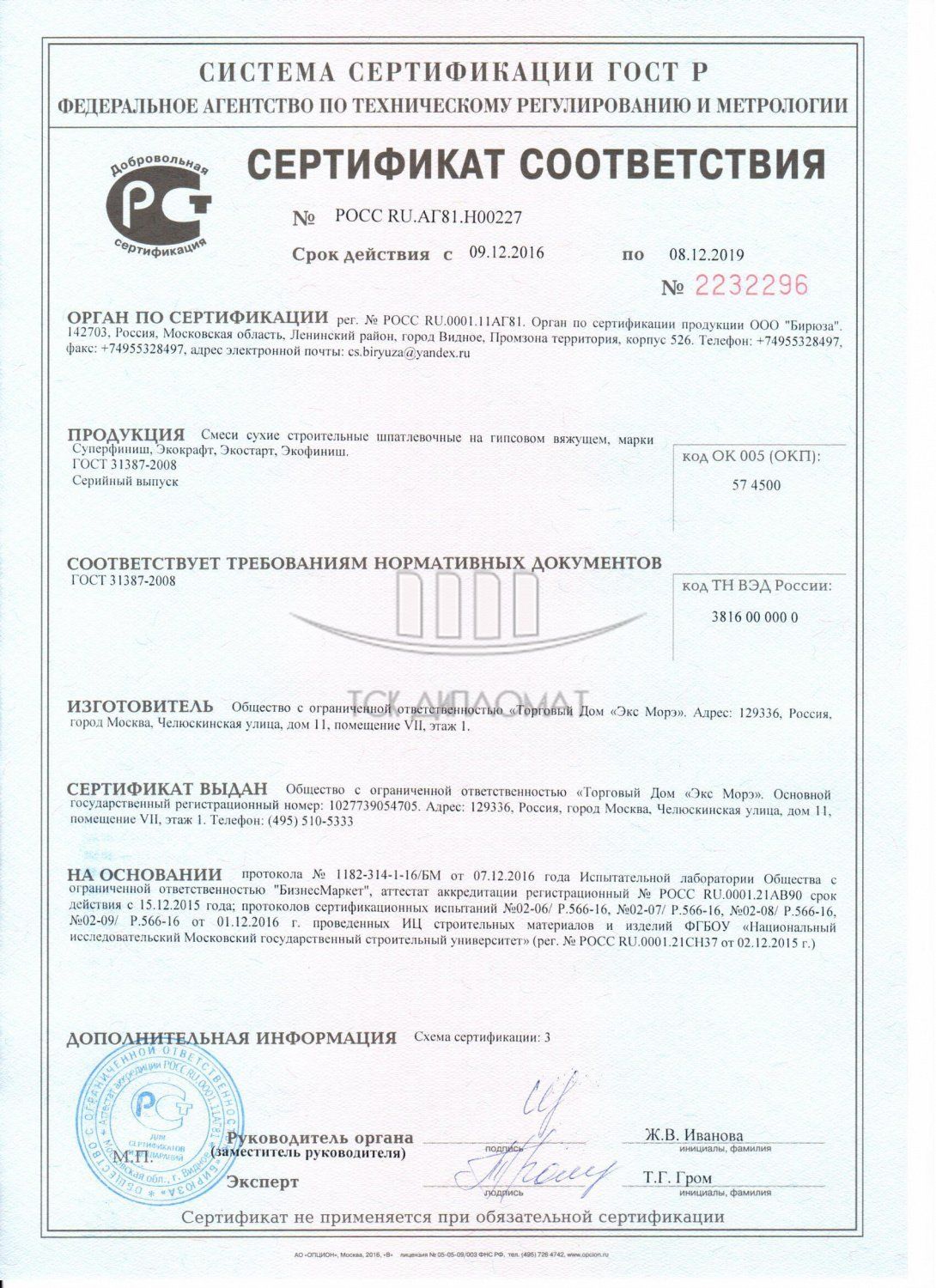 Сухая смесь поставляется в бумажных мешках по 20 кг. Мешки хранить в сухом помещении. Срок хранения в фирменной упаковке — 6 месяцев от даты изготовления.