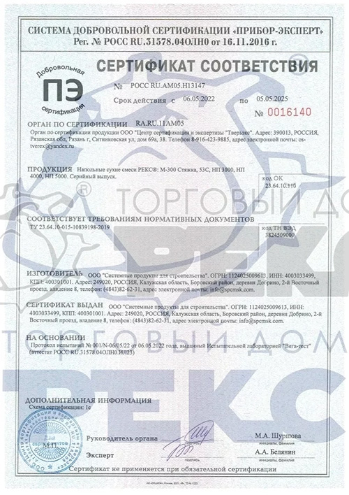 Время схватывания и отверждения может меняться в зависимости от температурно- влажностных условий. Большое содержание влаги в основании и низкая температура в помещении замедляют процесс высыхания состава, низкая влажность и высокая температура сокращают сроки его схватывания. При наличие деформационных швов в основании перенести их на верхний слой уложенного состава после набора прочности, необходимого для хождения. Также при площади заливки более 10 м² рекомендуется прорезать дополнительные деформационные швы, располагаемые между собой во взаимно перпендикулярных направлениях и имеющие соотношение сторон от 1:1 до 1:1,5. Прорезанные швы заполняют герметиком. РЕКС® НП 3000 не подлежит окраске и не рекомендуется для использования без напольного покрытия. Керамическую или каменную плитку можно укладывать через 3 суток. Паркет, линолеум, ламинат, ковролин, деревянные полы, пробковое покрытие – в соответствии с рекомендациями производителя напольного покрытия (с обязательным контролем влажности основания), но не ранее чем через 7 суток. Окончательная прочность достигается на 28 сутки. Эксплуатация системы «Теплый пол» возможна не ранее чем через 28 суток после нанесения.