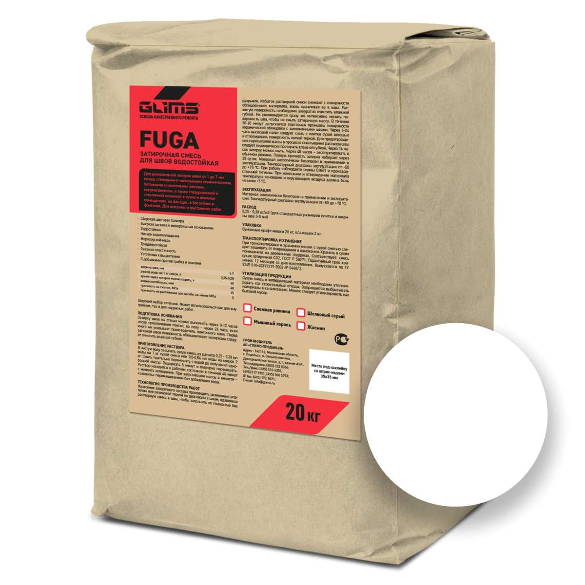 Затирка для межплиточных швов водостойкая Fuga Glims, Снежная равнина, мешок 20 кг