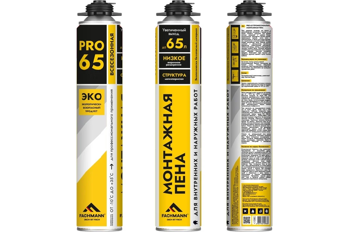 Пена FACHMANN PRO-65 является всесезонной и может использоваться для монтажных работ в любое время года при температуре от -10°С до +35°С. Термостойкость отвердевшей пены — от -40°C до +90°C.