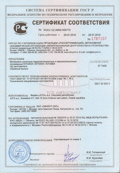 Пленки серии Juta ЮТАФОЛ Д (Ютафол Д Стандарт, ЮтафолД Специал, ЮтафолД Стандарт, ЮТАФОЛ Д Сильвер) представляют собой трёхслойный полимерный материал, состоящий из несущей плетёной армирующей полиэтиленовой сетки, ламинированной с обеих сторон л полиэтиленовой плёнкой. Армирующая сетка придает пленке высокую прочность, а двустороннее ламинирование обеспечивает хорошие гидроизолирующие свойства.